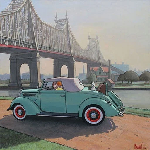Marabout copied Hopper’s seedy urban landscapes and placed Hergé’s boy adventurer at the heart of them, making him interact with provocative pin-ups; sharing a drink with one in Hopper’s famous Nighthawks, kissing another in an imitation of Queensborough Bridge.